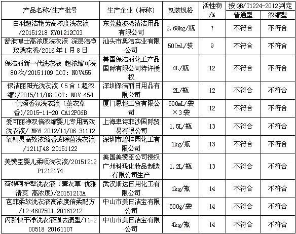本次检测中,有4个洗衣液产品虽然宣称浓缩的概念,但其理化指标却并未达到QB/T 1224-2012行业标准规定的浓缩型洗衣液产品指标,其产品活性物含量在15%到24%之间,若按普通型产品标准进行检测,仅符合普通洗衣液产品行业标准。