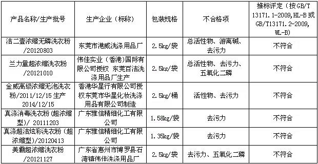 2、本次检测中,不符合国家标准的浓缩洗衣粉产品主要为反映产品内在质量的活性物、去污力、游离碱等指标不符合国家标准规定,这些产品多数不符合指标在2个以上,且与标准要求相差较大,例如标称为东莞市港威洗涤用品厂生产的“洁二壹浓缩无磷洗衣粉”,活性物含量仅为6%,而游离碱含量高达15.1%,这将严重影响产品的洗涤效果以及对织物和使用者的安全性。