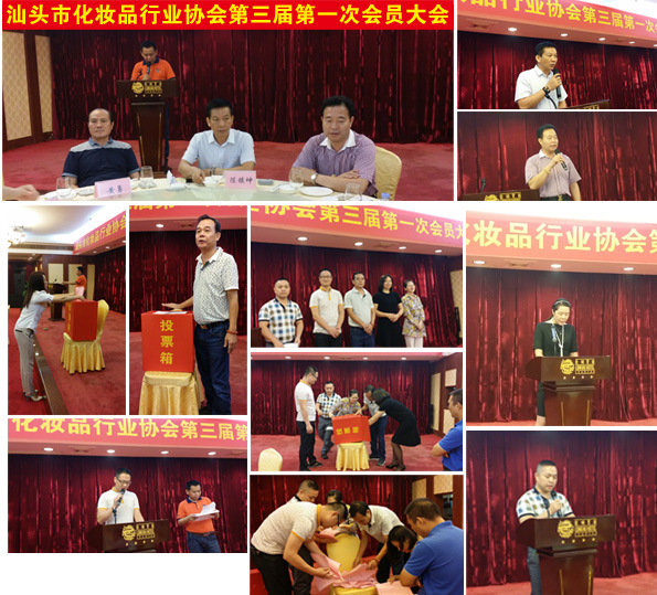 汕头市化妆品行业协会第三届第一次会员大会于2015年9月29日下午16:00在汕头龙湖宾馆二楼龙湖宴会厅1厅举行。汕头市民政局局长陈镇坤先生、汕头市社会组织管理局综合执法科科长林湘华女士、副科长姚军先生,汕头市食品药品监督管理局副局长黄勇先生、保化科科长黄坤明先生、许伟龙先生莅临监督指导。参加此次会议的会员单位有122人,占总会员数(180人)的三分之二以上(达68%),符合章程规定应出席人数。