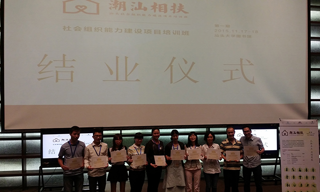 2015年11月17—18日,由汕头大学国家社会工作专业人才培训基地主办、广州市恭明社会组织发展中心承办、李嘉诚基金会资助的“潮汕相扶”汕头社会组织能力建设项目首期基础培训于汕头大学开班。共有来自汕头、潮州、揭阳等潮汕地区 72 家社会组织的 119 人参加为期两天的“社会组织治理与项目管理”主题的学习,汕头市化妆品行业协会专职人员参加此次培训。